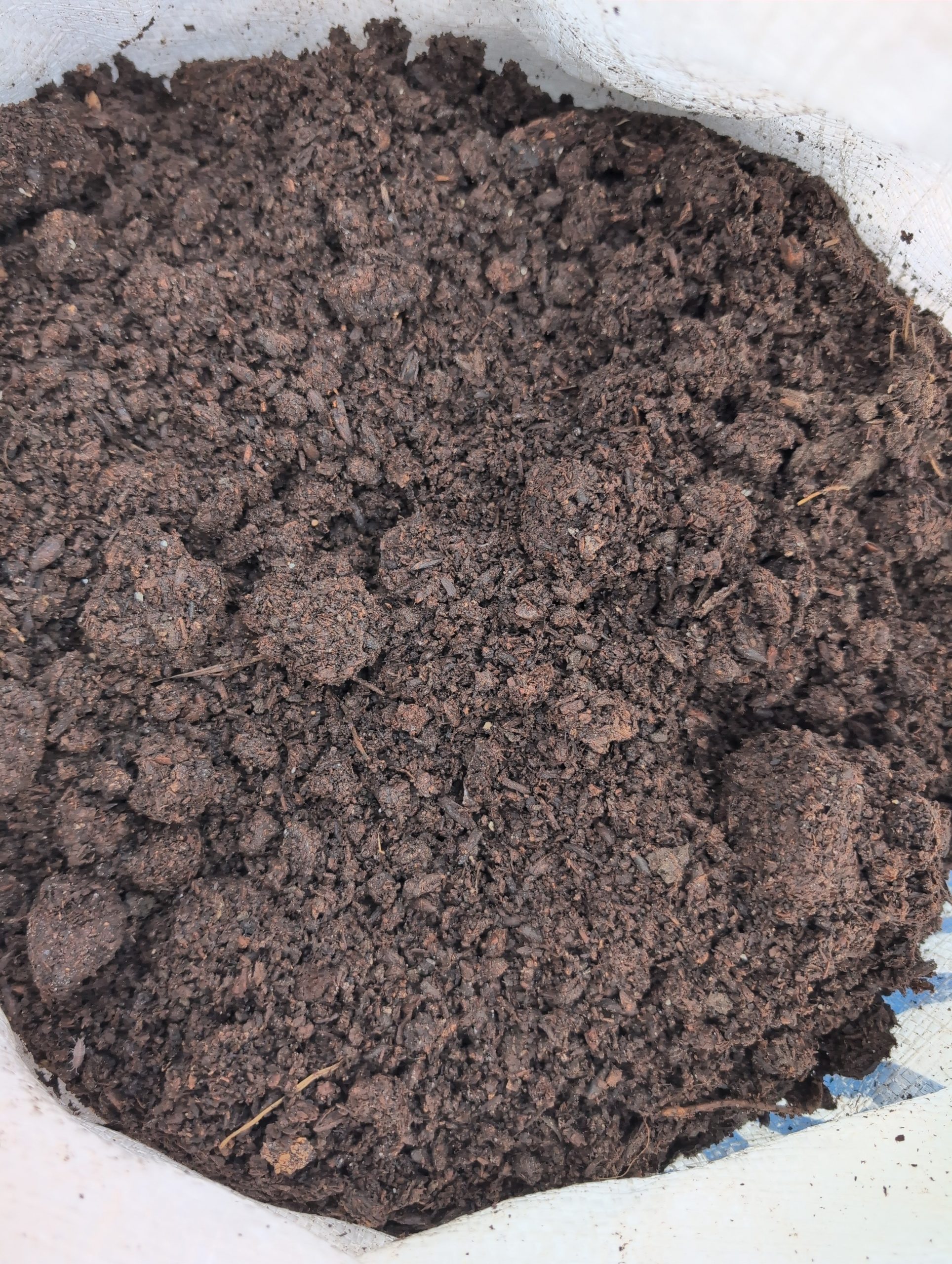 Hot composted spent mushroom substrate went through two hot composting cycles where the compost pile reaches 60-70°C due to microbial activity resulting in a finished compost.